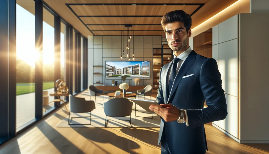 Timothy, a real estate agent, engaging warmly with a client in a modern office.